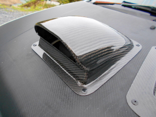 | 吸入口にあたる部分を開口し、全体を耐水ペーパーの#1500で水研ぎし、 クリヤーを塗って完成! 早速アルトのボンネットにリベットで装着。 |