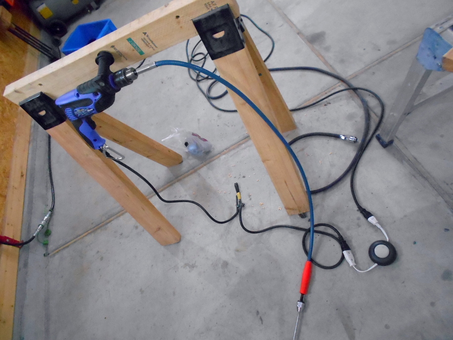 | 電気ドリルにフレキシブルシャフトを付けた物も使用します。 使い易いようにフットスイッチに接続してあります。 電気ドリルは微妙な回転数調整が出来、トルクがあるので、仕上げ段階の微妙な削りや磨きに適しています。 |