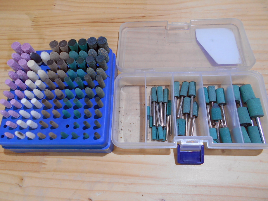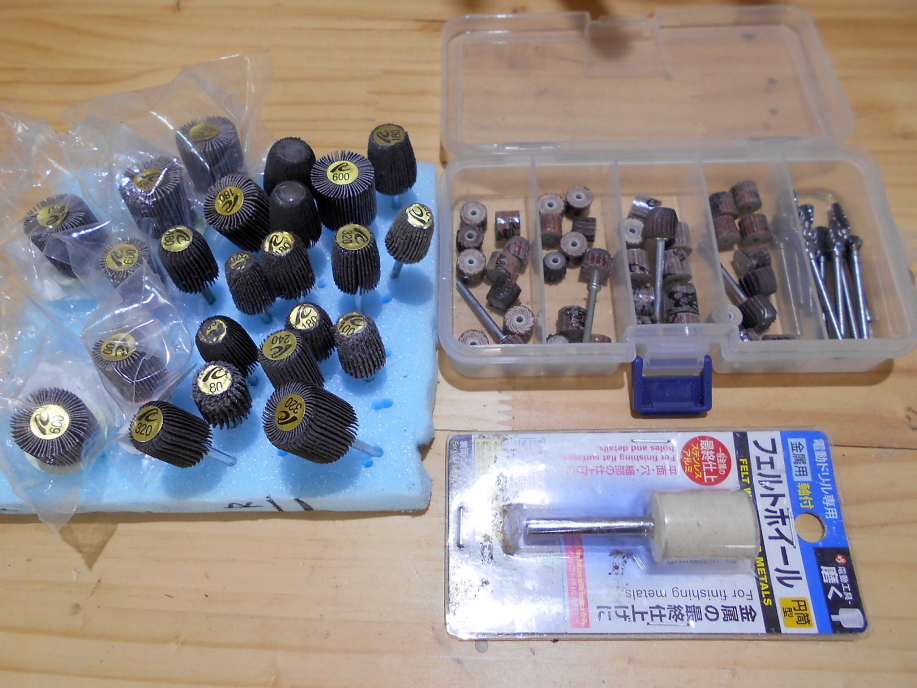 | フラップホイールもいつの間にか色々なサイズと番手が揃ってしまいました。 左の方が普通の3mm軸のフラップホイール。 直径が太い物と細い物、番手も各太さで#80〜#600まで6種類あります。 ケースに入っているのはマイクロフラップホール。 見ての通りかなり小さいので、狭い箇所でも難なく磨く事が出来ます。 主にシートリング付近の研磨に使います。 最後のフェルトホイールは普通、1個500円前後しますが、これは「某大手100円ショップ」で売られていて、もちろん1個100円です。 見つけたら即座に売り場にあるもの全部を買い占めてしまうのでウチの近所で他の人が手に入れる事は困難になっております(笑) |