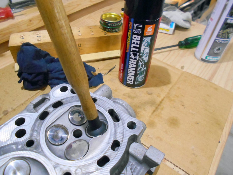 | さて、ポート、バルブ共加工が終わったので、バルブの摺合せをします。 シートはあまり荒れていないので、最初からバルブコンパウンドの細目のみで行います。 ステムに潤滑スプレーを塗布して差し込みますが、現在ウチでは潤滑剤に 「ベルハンマー」というものを使っています。 潤滑性能が一般的な潤滑スプレーよりかなり高いです。 値段もびっくりするほど(?)高く、画像に写っているのは一般的な5●6と同じ大きさで なんと3500円もします! なので出来るだけ無駄吹きしないように大事に使っています(笑) |