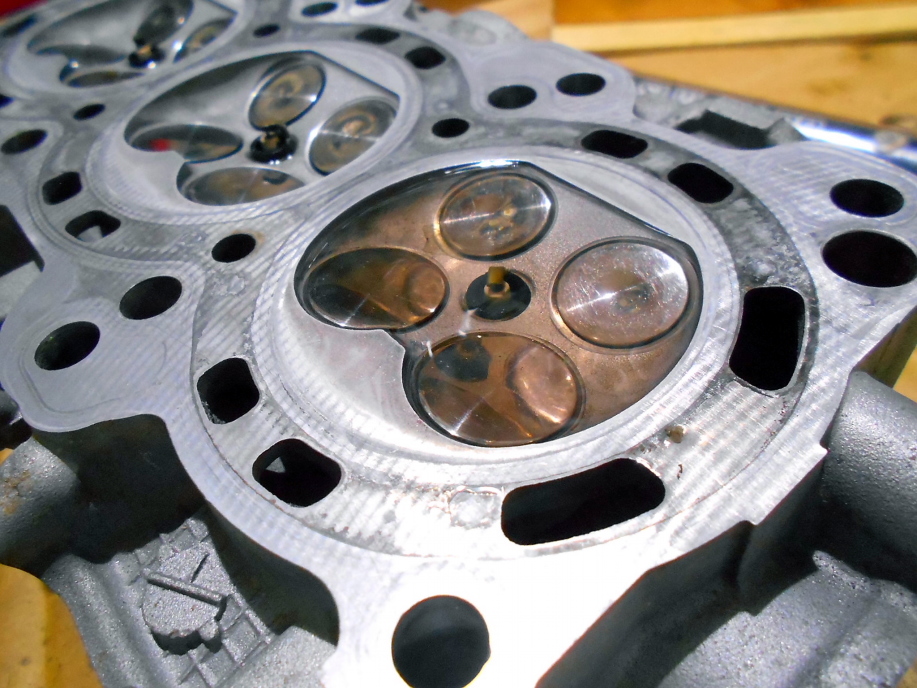 | 摺合せのチェックは光明丹ではなく燃焼室にガソリンを入れて行います。 光明丹ももちろん持ってはいますが、いくら光明丹で当たりが良く見えていても、最終的にガソリンを注いだ漏れチェックで漏れてしまっては無駄骨なので最近はめっきり使っていません。 インテーク側はさっと摺っただけで全く漏れなし。 エキゾースト側が3カ所ばかりガソリンが滲み出したので、再度研ぎ直してから再チェック。 12本全部漏れなく仕上がりました。 |