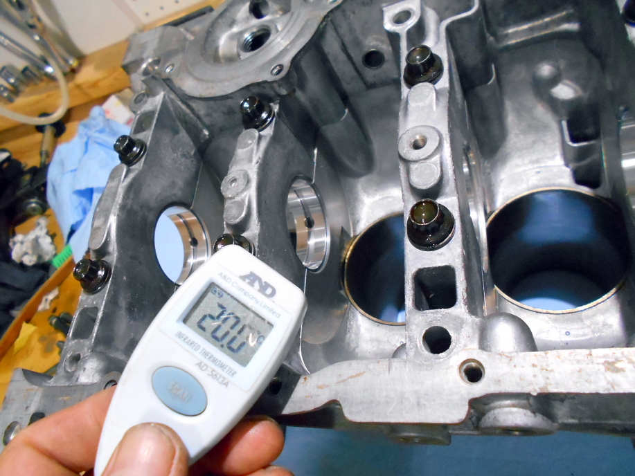 | メタルやガスケット類が揃ったので腰下から組立てに入ります。 メタルクリアランス計測の為、ガレージのエアコンを全開で冷やし、20℃まで下げました。 |
