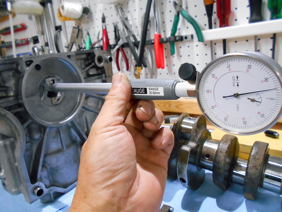 | メタルはシリンダーブロックとクランクシャフトの刻印から選択して用意したので、まぁ普通はそのまま組んでも特に問題ないのですが、一応計測して確認しておきます。 クランクメタルは基準値が0.02mm〜0.04mm。 限度値が0.065mmとのこと。 計測はシリンダーボアゲージで行いました。 計測値は0.045mm〜0.05mmなので基準値よりちょっとだけ広いですが問題無し。 |
