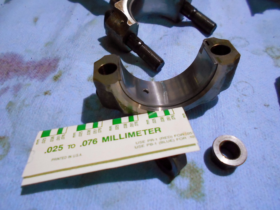 | 続いてコンロッドメタルも同じようにボアゲージで計測しましたが、なんか広い・・・。 基準値はクランクシャフトと同じ0.02mm〜0.04なのですが、計測値は0.07. 一応確認の為にプラスチゲージを使って計測しましたが、やはり0.07程度はあるようです。 限度値超えなので、もうワンサイズ位厚みのあるサイズのメタルを注文してみましたが・・・。 コンロッドメタルはこの1種類しか供給が無いとの事・・・そんなバカな・・・。 コンロッドとクランクシャフトも交換しないと駄目? いやいや、そんな予算は無いので、試しに元々このエンジンに付いていた古いメタルを使って計測してみたところ、新品のメタルと同じクリアランスでした。 どっちみち選択肢はないし、これで今まで普通に動いてたんだから大丈夫だろうと無理やり納得し(?)、新品のリングを組んだピストン&コンロッドをブロックに組み込むことにします。 |