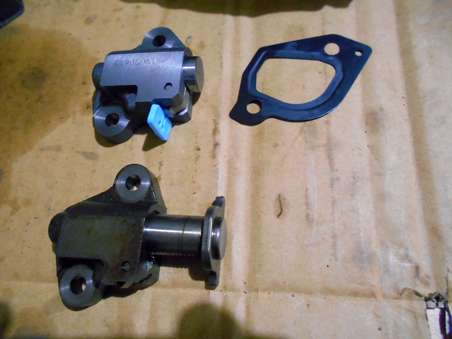 | チェーンテンショナーも新品を組み込みます。 元々付いていたテンショナー(下)と新しいテンショナー(上) 先端の形状が変更されている上、元々付いていなかったガスケットも取り付ける造りに変わっています。 |