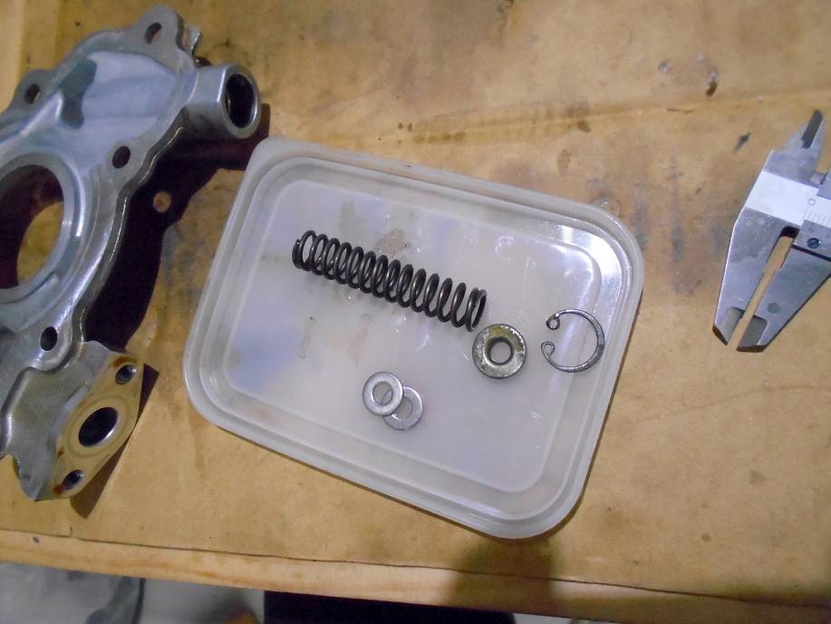 | フロントカバー内にあるオイルポンプも洗浄、点検して組み立てますが、いつものようにリリーフスプリングにステンレスのワッシャーを2枚(2mm位)かませて油圧アップしておきます。 | |