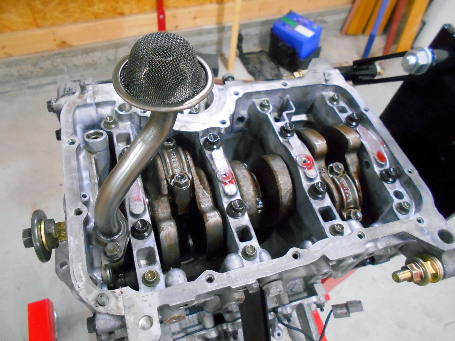 | フロントカバーを取り付けたらエンジンをひっくり返し、ストレーナー、オイルパンを取り付けます。 | |