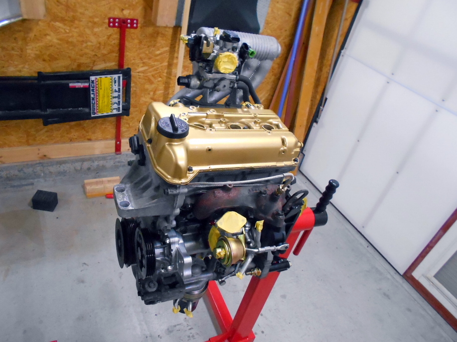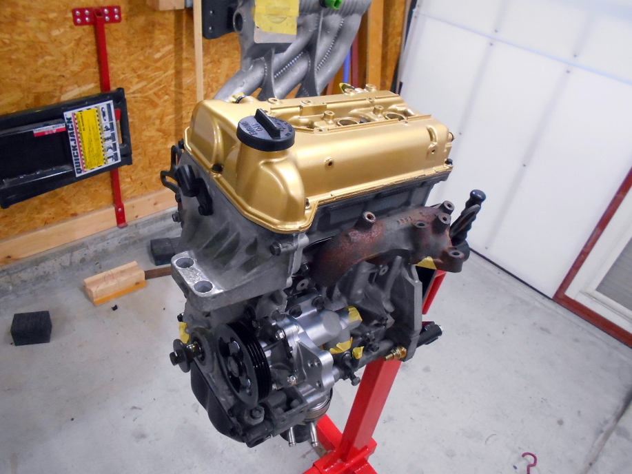 | 1ZZの時と同じ金色に塗ったヘッドカバー、インマニ、エキマニを取り付け。 ウォーターポンプは新品を取り付けてあります。 |