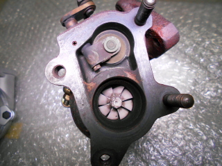 | GT100タービンのエキゾーストハウジング。 タービンホイールそのものは特に変わりないように見えます。 ただタービンホイールとハウジングのクリアランスがやや広くなっている感じです。 排気の抜けとかの問題なのかな? あとはウエストゲートバルブとタービンホイールの仕切りの壁が無くなっています。 これは一般的にはあった方が良いとされていますがどうなんでしょう。 |