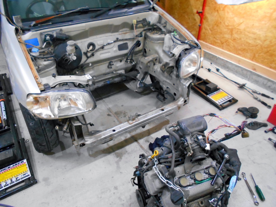 | コアサポートを撤去するとこんなにスッキリ(笑) この後、扉開閉用ウインチで少しエンジンを持ち上げてエンジンを取り外します。 |