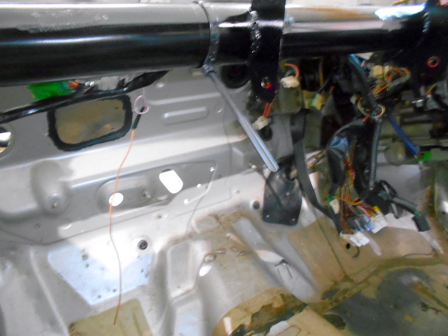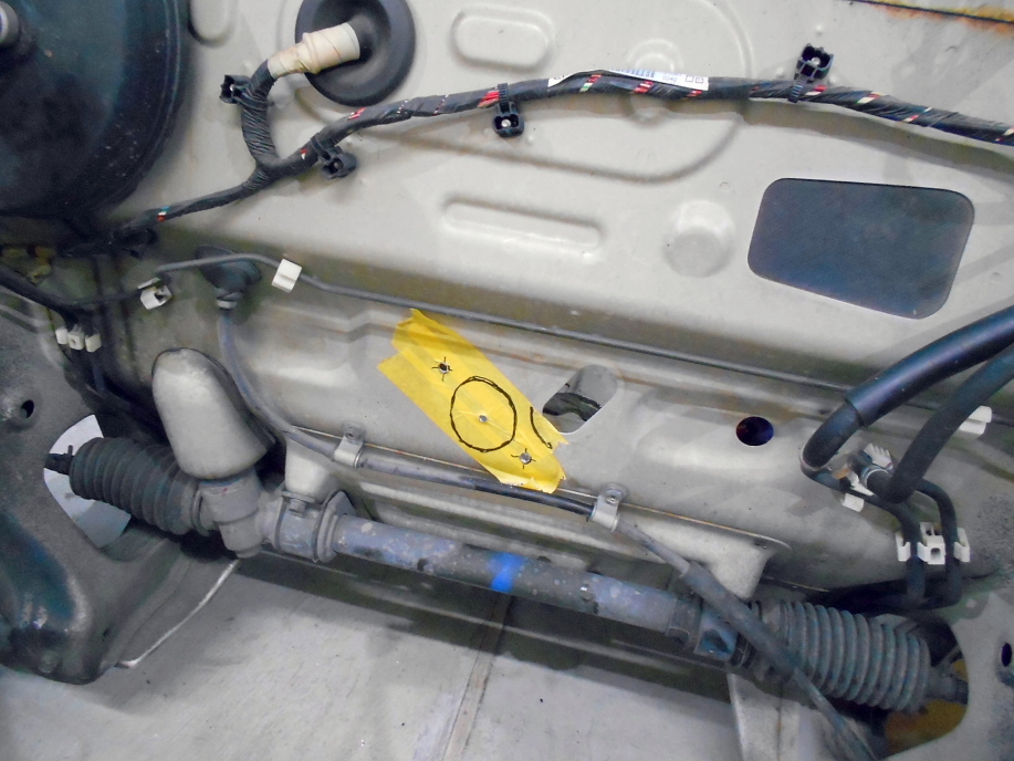 | シフトコントロールがロッド→ワイヤーになるので、ワイヤーを通す穴を空けなくてはいけません。 Keiのボディーから採寸して穴位置を写しておきます。 |