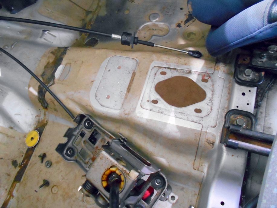 | シフトレバーのユニットも移植しますが、後ろ側の取り付けボルト2本は位置が同じなので、前側の2本分だけ新規に穴を空けます。 | |