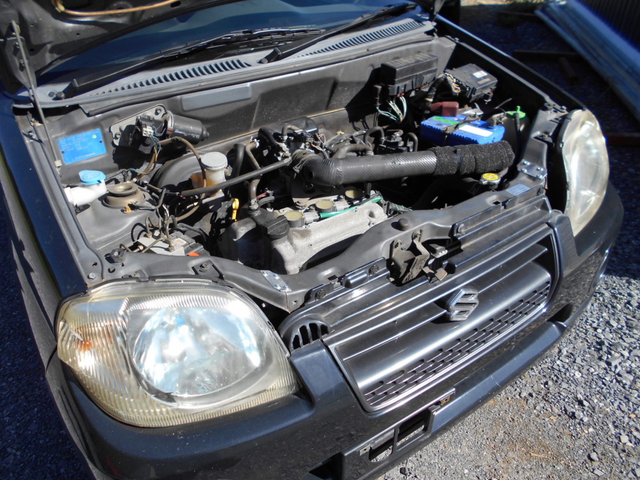 | アルトバンをターボ化する為にエンジンを入手。 ただ、NA車とターボ車ではエンジンだけではなく、シフトがロッド式→ワイヤー式になっていたり、別途燃料ポンプやハーネス、ECU、ドライブシャフト・・・etc と結構パーツ交換が必要なので、車両ごと手に入れた方が安上がりに全てのパーツが揃う為、 ←こちらの「Kei スポーツ」平成14年式(145000k走行)を某オクにて6万円で購入。 エンジン自体はKeiワークスと同じですがエアロとかLSDの有無のせいかオークションでは不人気(?)だったので同年式のワークスよりだいぶ安い価格で手に入れる事が出来ました。 ちょろっと近所を試運転して問題が無いことを確認し、早速エンジンを取り外します。 |