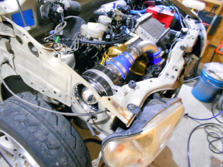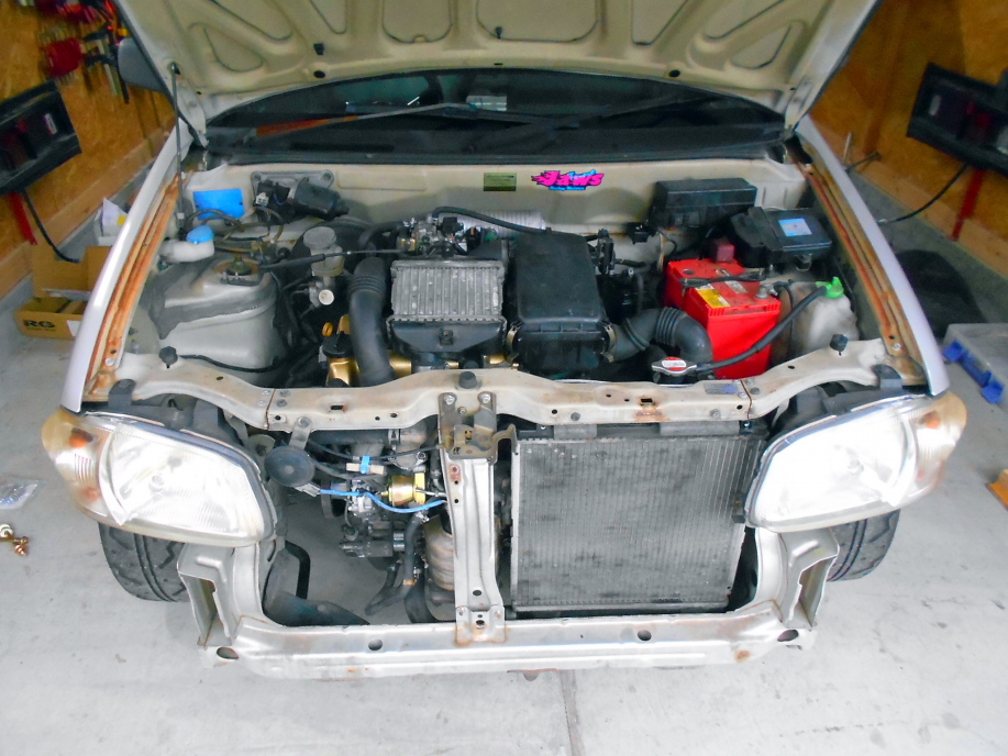 | エンジンとミッションをまとめて吊り上げて搭載。 周辺パーツも取り付け完了し、 アルトバン改ターボの完成です! とりあえず現状ではエアクリーナーやインタークーラー、マフラー等はノーマルのままですが 追々変更していきます。 ただインタークーラーはノーマルのボンネットでは全然冷えないので何とかしなくては。 |
