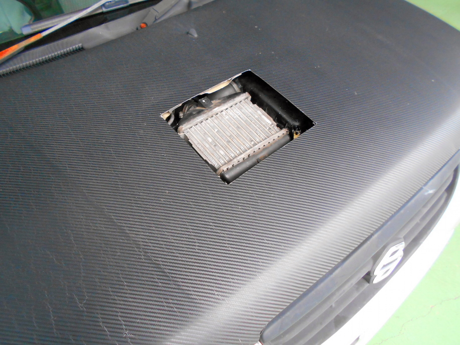 | 最終的には前置きインタークーラーにする計画ですが、予算の都合でしばらくはノーマルインタークーラーでしのぎます。 なのでボンネットのインタークーラーがある辺りにとりあえず開口。 |