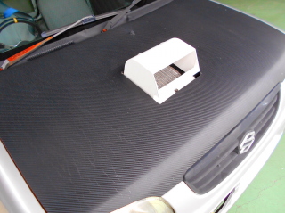 | 飛び出し具合もバッチリ(笑) 年代がバレてしまいますが、●ッド●ックスに出てくる●ンター●プターみたいでカッコイイ(笑) これならアルトワークスとかの純正ボンネットダクトより良く冷えるでしょ〜。 |