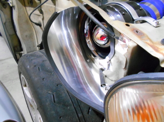 | タイヤハウス内から吸気するので、泥とか小石とかタイヤで跳ね上げた異物を少しでも防止する為、薄いアルミ板で仕切りを作って取り付けます。 |