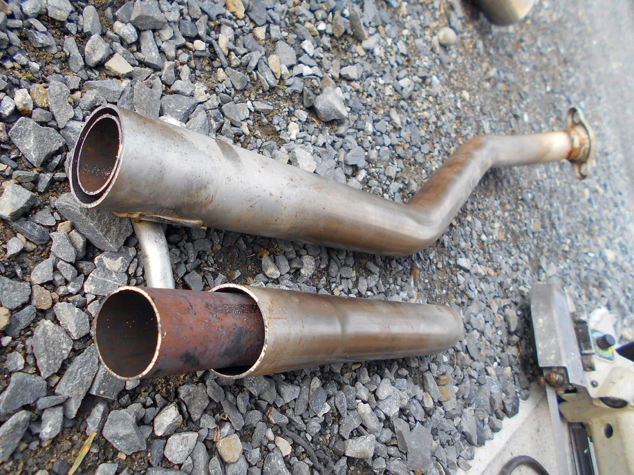 | 触媒後のフランジからエンジン下を通る部分は曲げが面倒だったので、この部分は純正を使いますが、切断してビックリ! 見た目よりなんか重いなとは思っていましたが、パイプが二重構造になっています。 しかも中のパイプがやけに細い・・・。 更に中のパイプだけ抜こうにも、2本まとめて曲げてあるので完全に抜き取るには曲がり部分を全て切断しないと取れそうにありません。 ・・・う〜む、今回は時間も無いのでこの部分はこのままにしておく事にします。 |