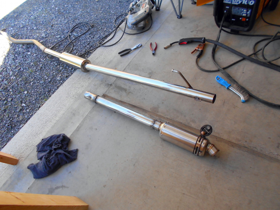 | 用意してあった50.8Φ1.2mm厚のステンレスパイプと中間サイレンサー、バイク用の汎用サイレンサーを順次溶接していきます。 マフラーは二分割とし、接続は差込みにしてスプリング式ジョイントを使用します。 |