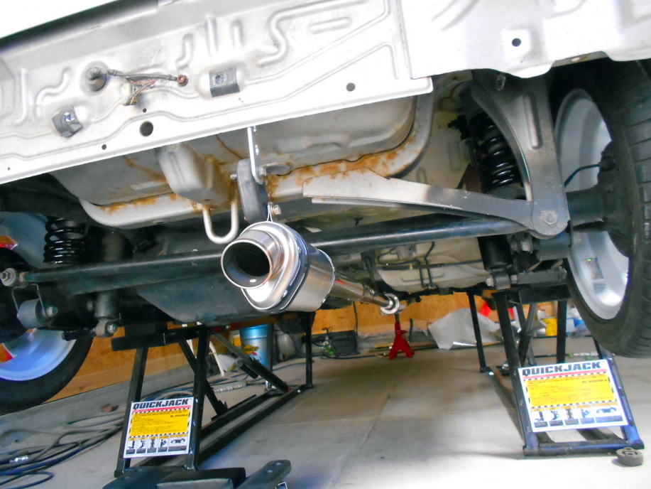 | 中間サイレンサー以降は完全にストレートにし、ホーシングの下を通します。 重量は純正のマフラーが12.3kg、自作マフラーが7.8kg。 4.5kg軽量化出来ました。 音量は・・・そんなに大きくないと思うけど計測してみないと何とも・・・。 |