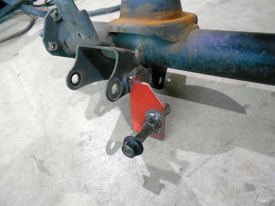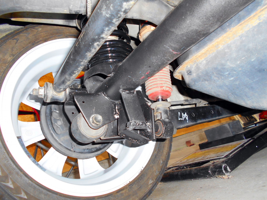 | サスペンションにも手を加えます。 リアのスプリングをよりハードな短い物に変更する事にし、組み込んでみたところショックのストロークが全く無くなってしまいました。 ショートストロークのショックに交換するのが理想ですが、今回はそこに予算は割けなかったので別なやり方でクリアします。 ストロークを増やすにはショックの取り付け位置の間隔を広げれば良いワケだから ショックの下側の取り付け位置をずっと下方に移動すれば解決です。 現物合わせでここいら辺に鋼材とボルトを溶接します。 |