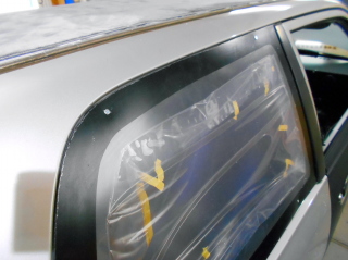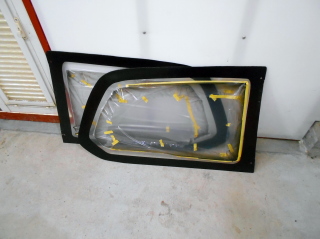 | 後ろのガラスも交換して軽量化をします。 後ろのサイドガラスは元のガラスの厚みが3mmのところを2mm厚のポリカーボネートに。 一枚2.1kgの物が730gになりました。 二枚合わせて2.74kgの軽量化。 |