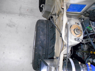 | 吸入空気をエンジンルームから吸い込むのは論外なので、右タイヤハウス内から取り入れる事にします。 エアクリーナーの吸気口より少し小さ目に穴を空けます。 |