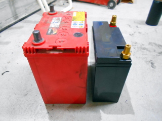 | 更なる軽量化の為にバッテリーも軽量なドライバッテリーに交換です。 左が元々付いていた60B19Lのバッテリー、重量は9.6kg 右がドライバッテリー、重量が6.6kg 見た目の大きさだと半分位になるかと思ったんですが、意外に重いですね。 それでも3kgの軽量化。 |