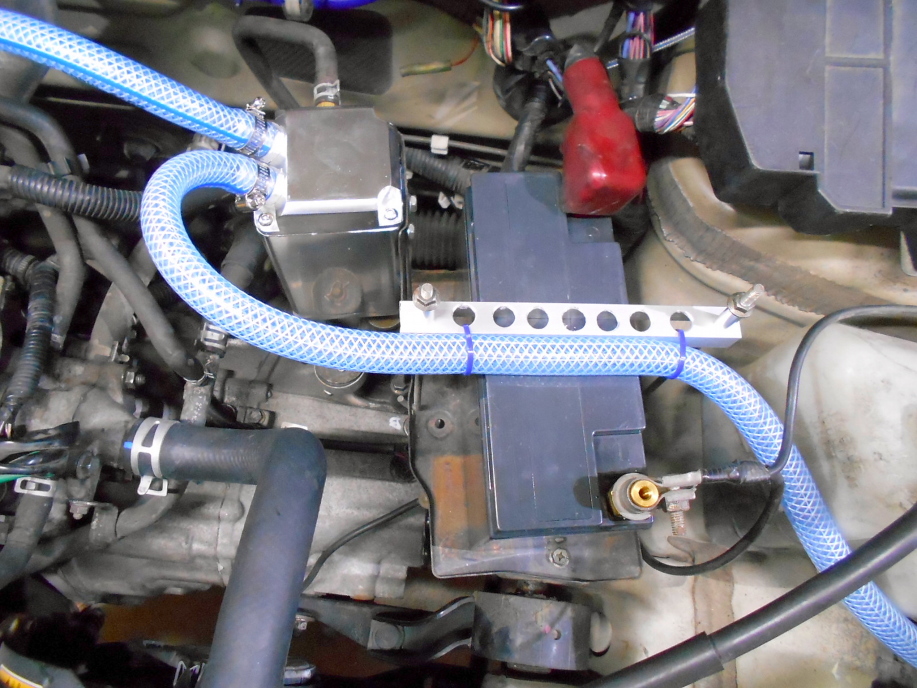 | ドライバッテリーなので横置きや室内置きも可能ですが、その為に配線を延長したりしてはその分重量増になるので敢えて行わず、純正のバッテリートレイにそのまま配置。 押さえるステーだけでもと、アルミ材で軽量な物を作って取り付けました。 純正トレイに付いていたキャニスターは取り外し、代わりにオイルキャッチタンクを装備してあります。 |