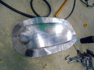 | アルトのヘッドライトからフレッシュエアーをエアクリーナーに導く、「ヘッドライトエアインテーク」を製作します。 エアクリーナーがある側のヘッドライトを取り外し、レンズ面をマスキングテープでしっかりマスキングした後、その上からアルミテープを隙間なく貼ります。 レンズから直接型を取った方がきれいに出来るのですが、レンズは溶剤に弱く表面が溶けて曇ってしまうので保護します。 周囲にフランジを作りますが、これはボール紙にアルミテープを貼った簡易な物です。 離型ワックスは特に塗らなくても問題ありませんが、簡単に剥がれるように一回だけ離型ワックスを塗り、拭き取りはしません。 |