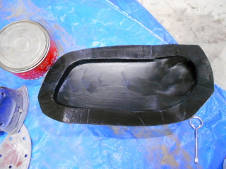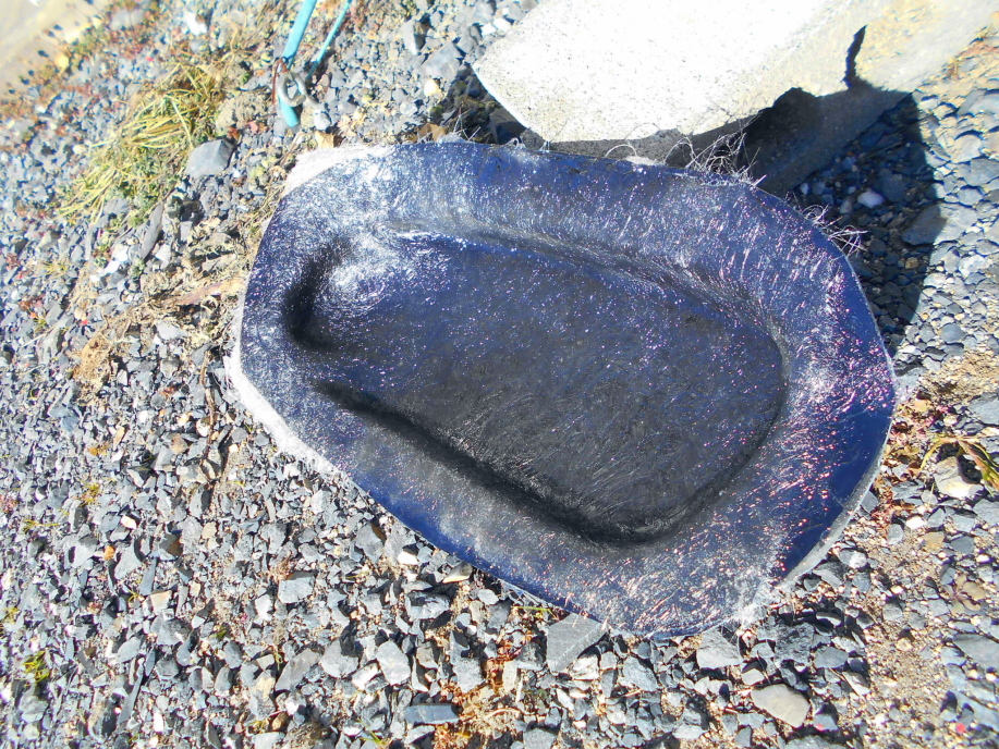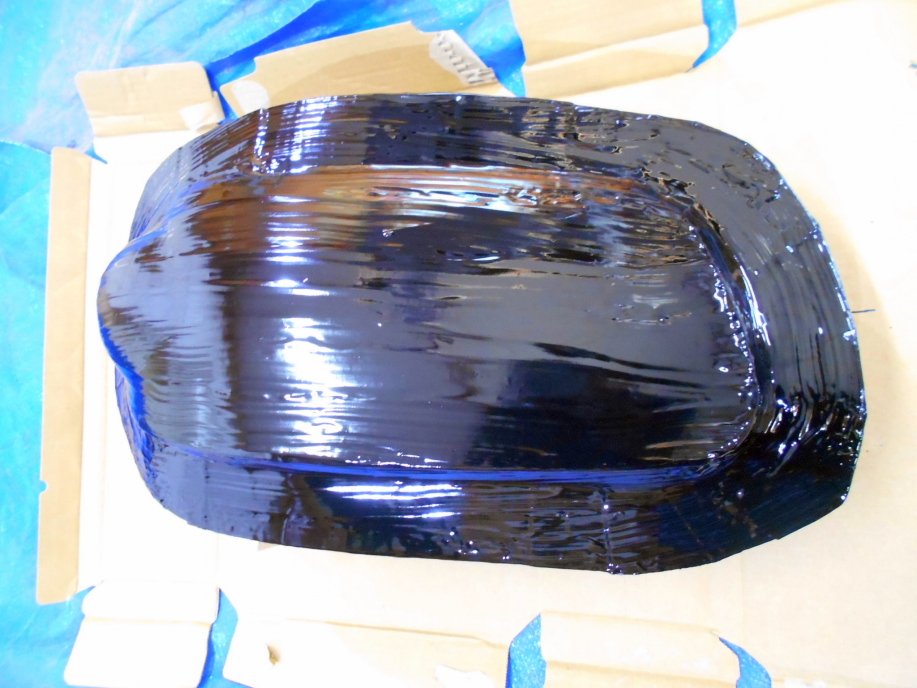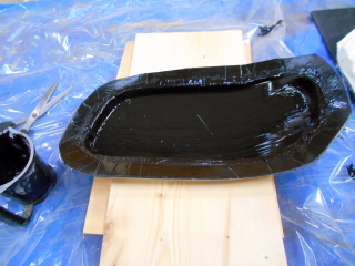 | ゲルコート代わりの樹脂には少し多めに硬化剤を入れ(2〜2.5%)て全面に塗り、入隅には特にしっかり塗ったら硬化し始めるまで少し待ち(当日の作業環境は15℃位で20分程度)、#450マットを3プライ、#200クロスを1プライ積層しました。 小さい型なので補強は特に入れていません。 |