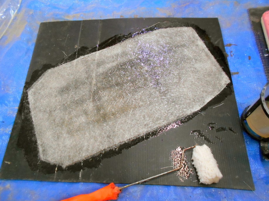 | #450マット2プライを貼り込みますが、小さい部品なので必要な大きさのマットを2枚切り出し、プラダンの上で予め樹脂を塗って浸み込ませ、樹脂が浸み込んで柔らかくなった頃合いでメス型に貼り付けます。 マットは既にフニャフニャなので型馴染みが良く、脱泡作業もかなり楽に出来ます。 |