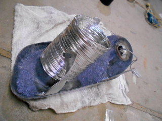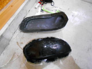 | レンズ正面の平らに近い部分はサンダーを当てられたのでほぼアルミテープの段差は削り落としましたが、フチに近い部分は面倒なのでそのまま。 成型品では皺部分がちょっと出っ張るだけなので削るのは簡単です。 全面を軽く水研ぎしましたがこれまた面倒なので#320程度で掛けておしまい。 これでメス型完成です。 続いて離型処理ですが、浅いメス型なので離型ワックス処理も3回で済ませました。 その後PVAを塗って乾燥待ち。 |