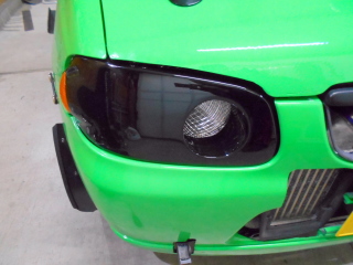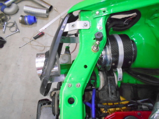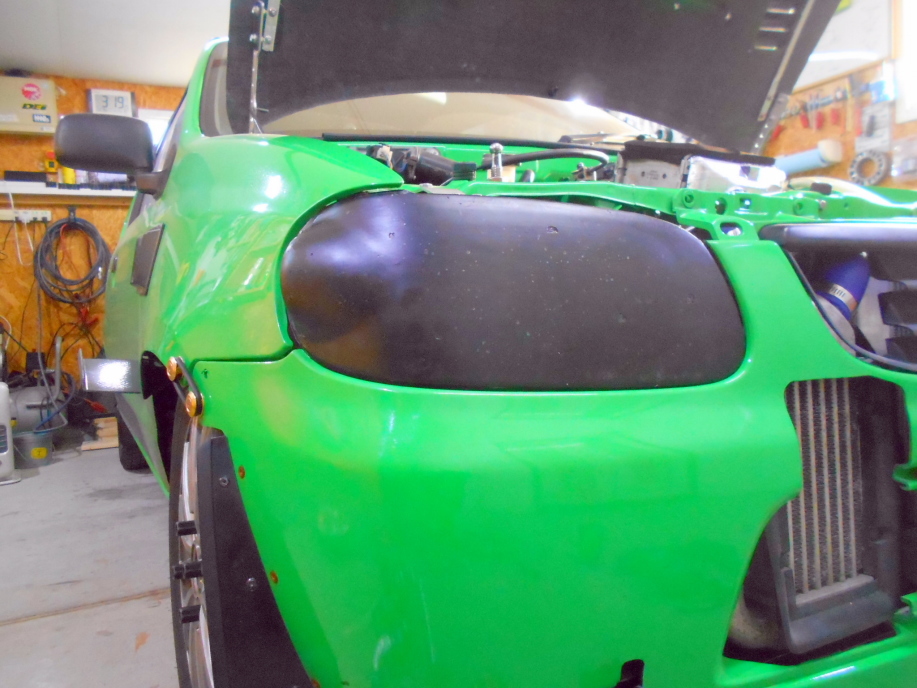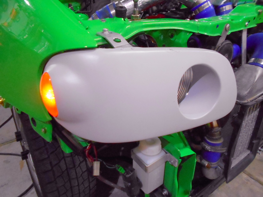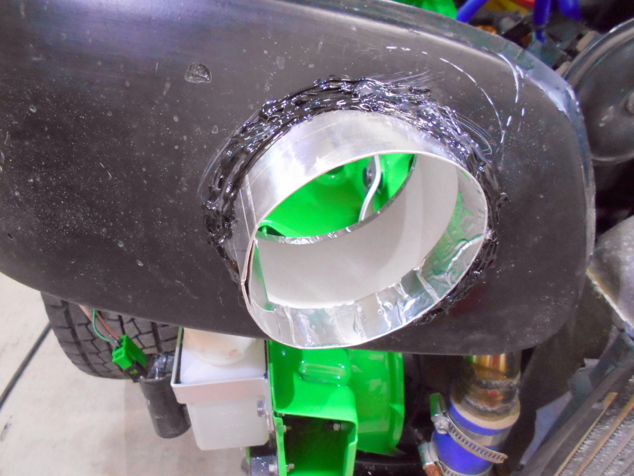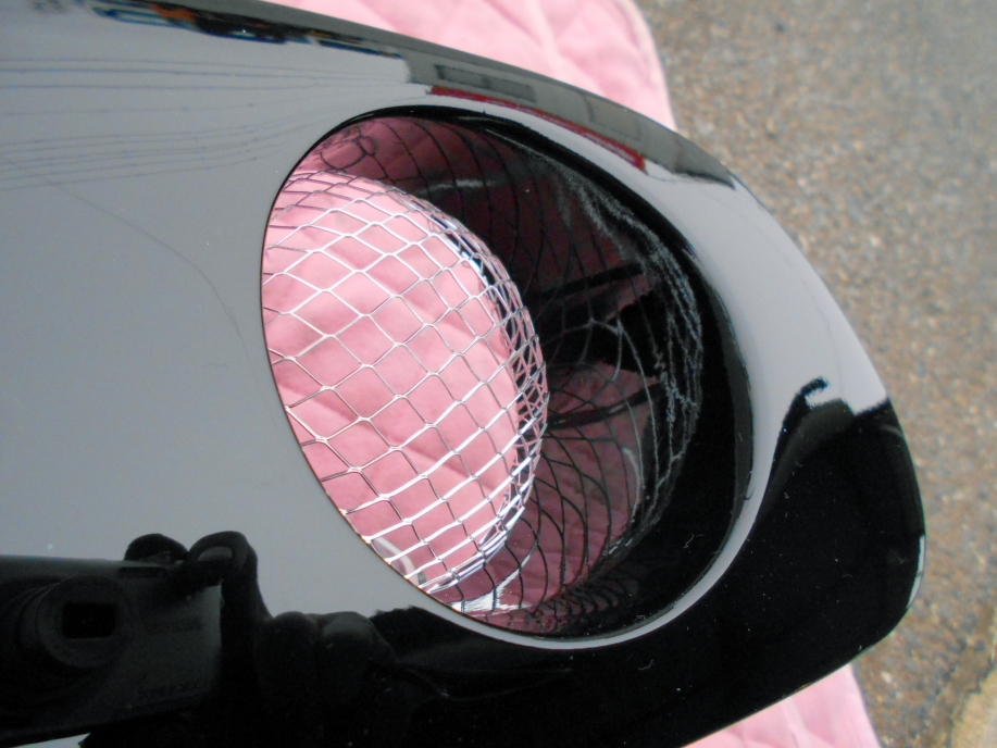 | ほぼ出来上がったヘッドライトインテークを仮付けして確認。 これを取り付けた状態ではこの穴からしか吸気しないので吸気温度はかなり抑えられる筈です。 |