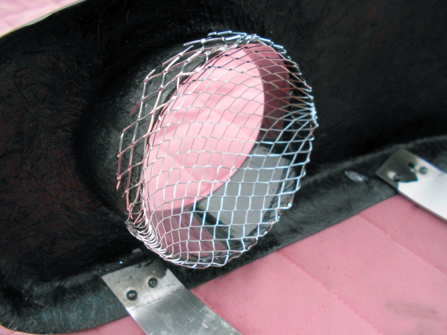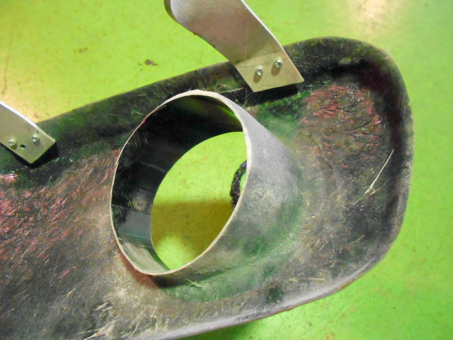 | 吸入口なのでアルミネットを付けて大きな異物が入るのを防ぎます。 アルミネットは半球型に成形し、裏側から当ててフチを折って仮留め、この上からアルミダクトを差し込んで固定します。 |