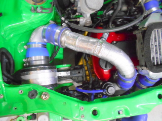 | エアクリーナーの取付位置変更に伴い配管を加工します。 自宅に在庫していた配管類やシリコンジョイント、パイプを溶接したりして配管の手直しをしました。 |