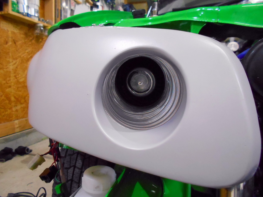 | エア取り入れ口のレイアウトを検討します。 今までタイヤハウス内に向けていたエアクリーナーも前側に向けます。 なるべくストレートにエアクリーナーに取り入れられるような位置でライトカバーに穴をあけます。 100Φのアルミダクトを使う予定なのでそれよりほんの少し小さ目、98mmで開口。 |