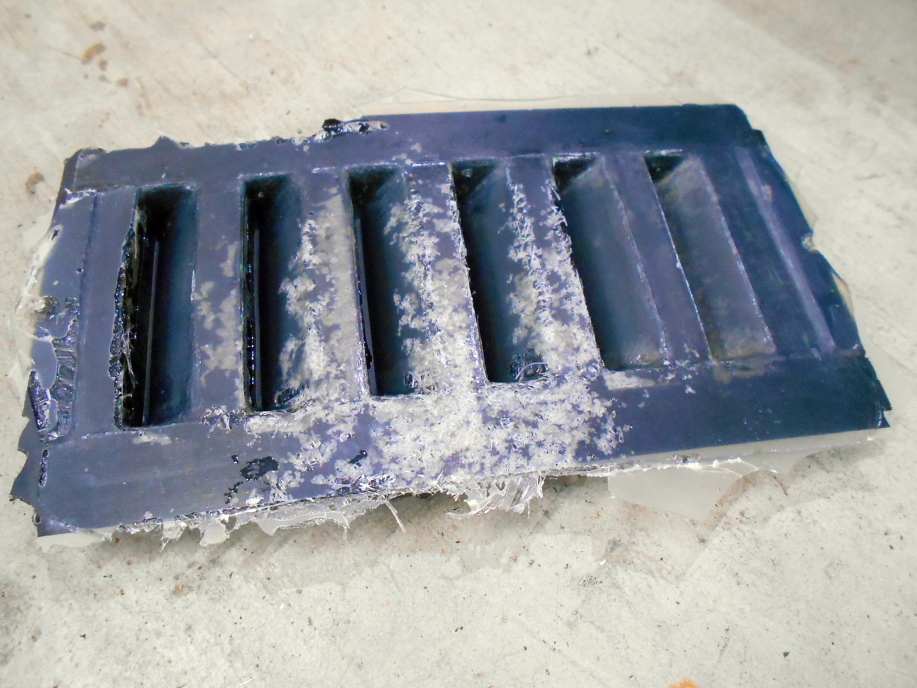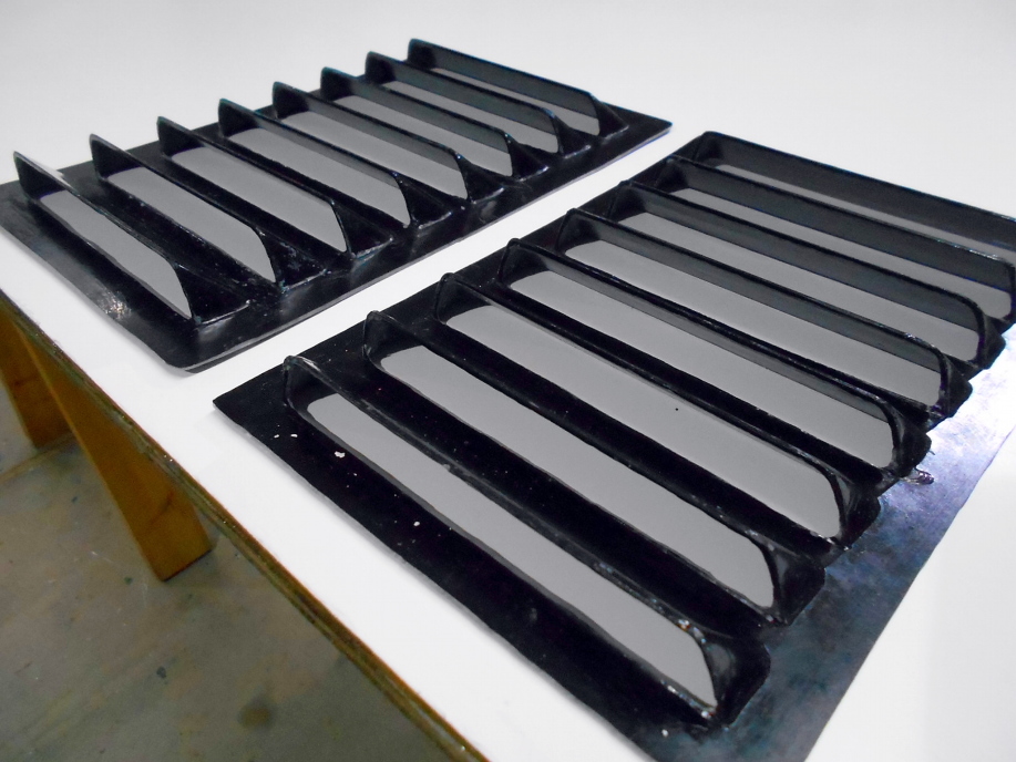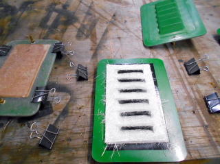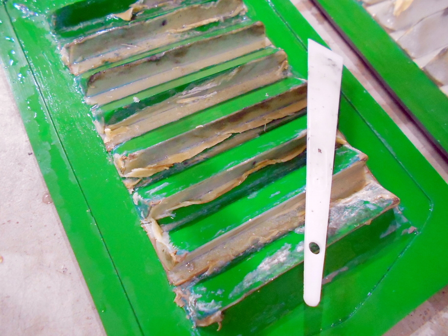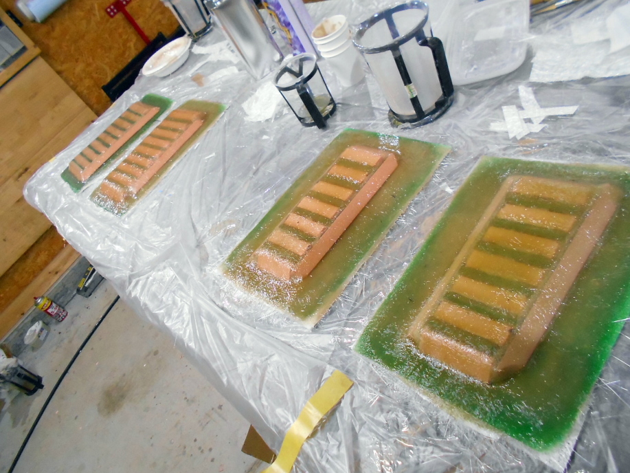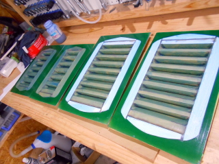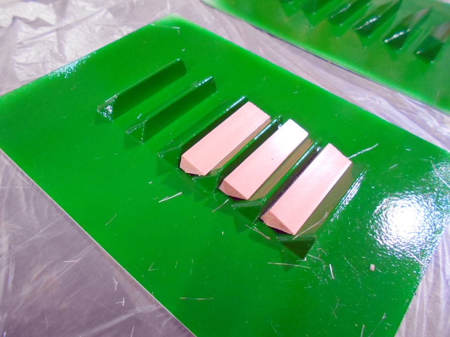 これまたメス型の積層時と同じように、ルーバーの凹部に面木を補強兼繊維押さえとして入れ込んであります。