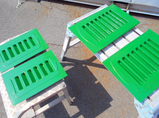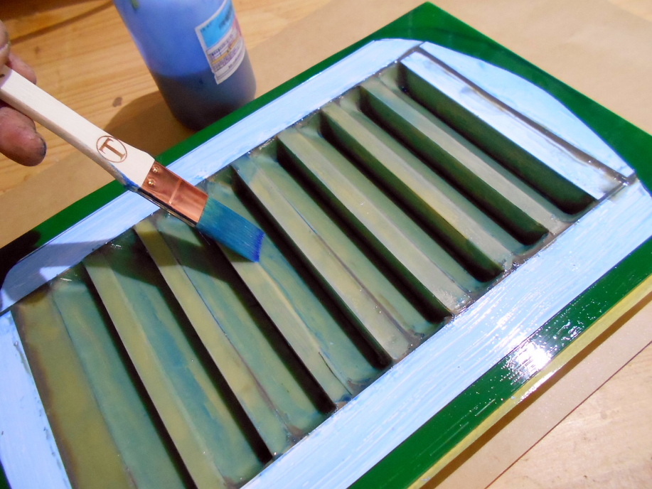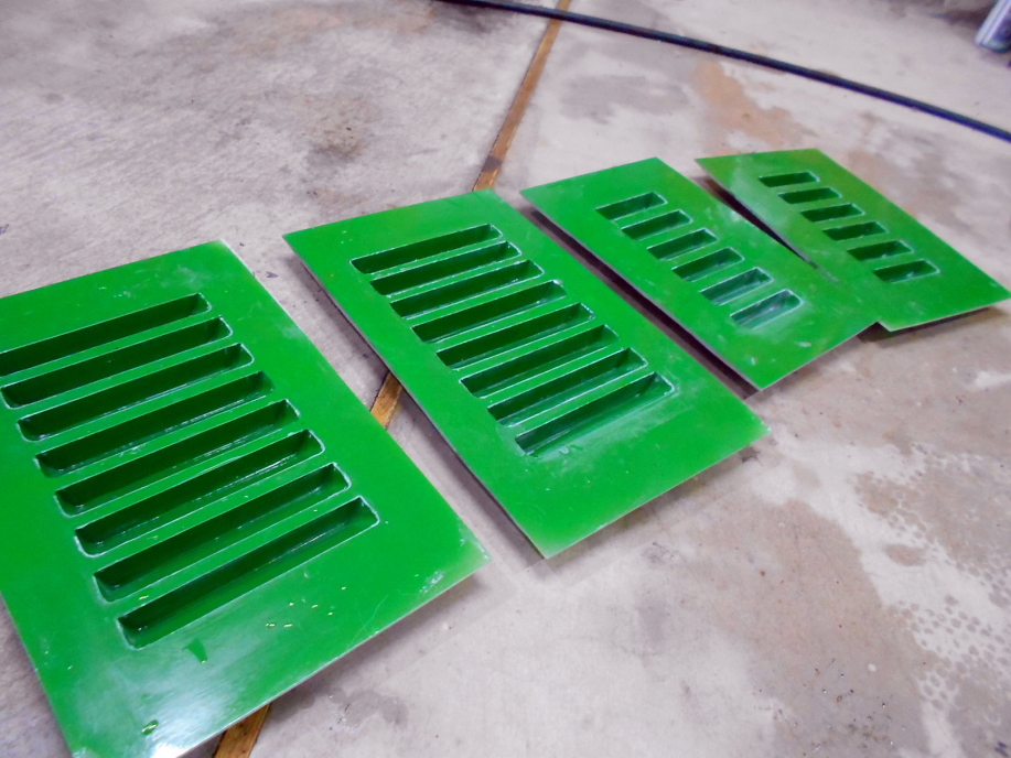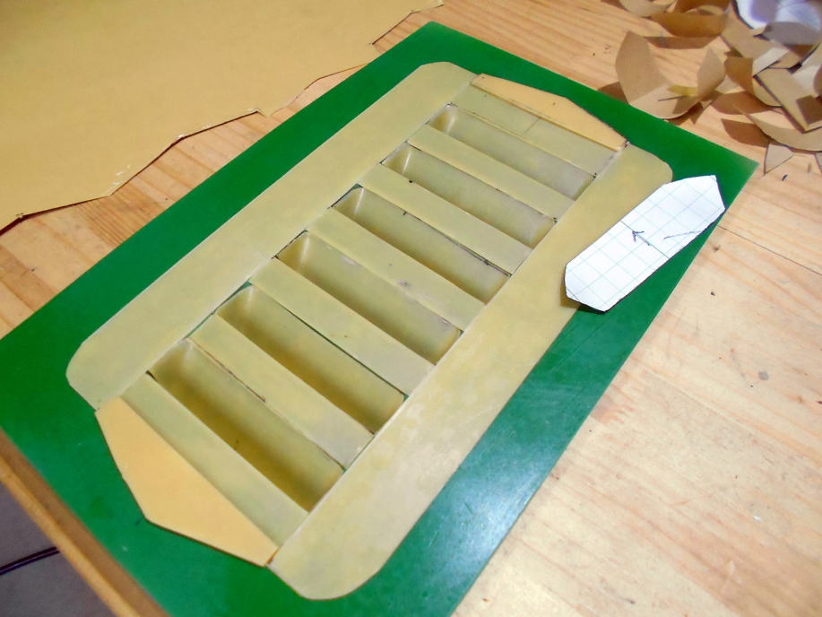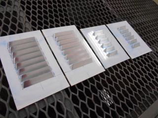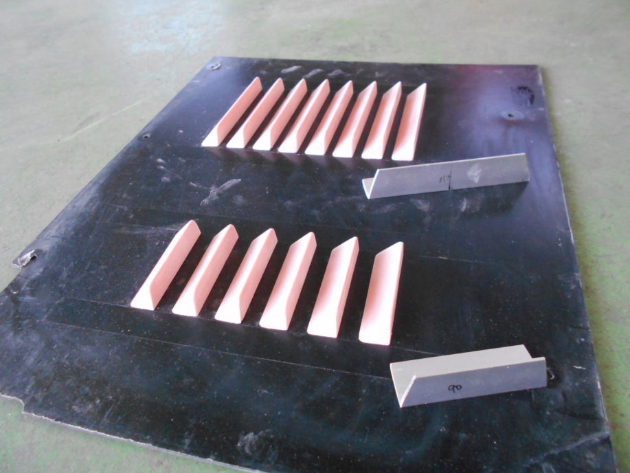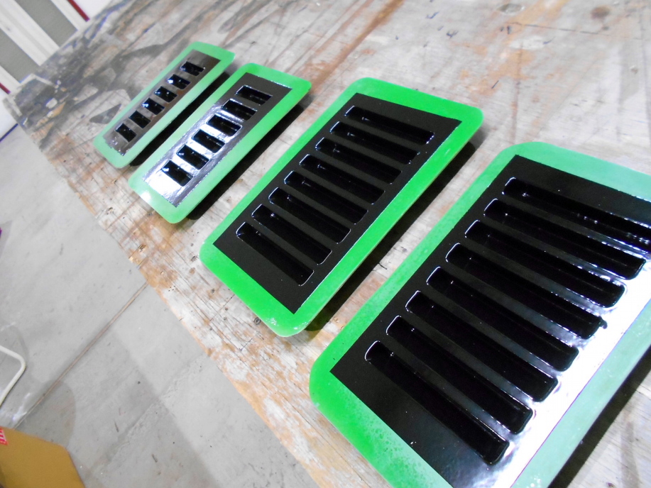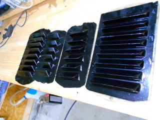 これまたメス型の積層時と同じように、ルーバーの凹部に面木を補強兼繊維押さえとして入れ込んであります。