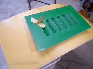 あとはこの塩ビ板をガラスマットの上に載せ、その溝をカッターで切るだけで毎回同じ形に繊維を切り出す事が出来ます。 |