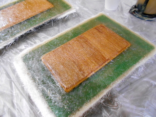 また、面木の上から4mm厚ベニヤで更にギューッと押さえ込んで樹脂とエアを絞り出し、重しを置いて半硬化位まで待ち、ベニヤの上から2プライ貼り込んで終了です。