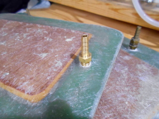 オス型にはインフュージョンの準備として真空引きと樹脂注入用のニップルを取付けます。
