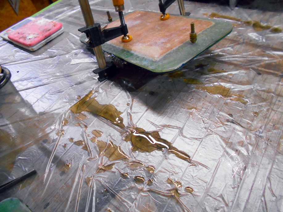 型の中の繊維の量からしても樹脂が入り過ぎるし、いつまでもエアが出てくるので、適当な所で切り上げて終了。
