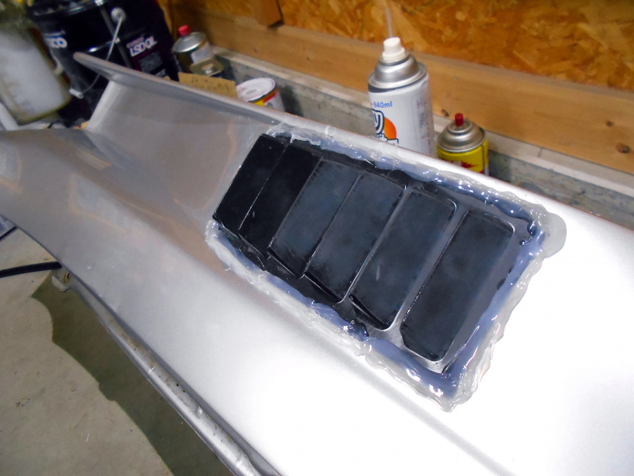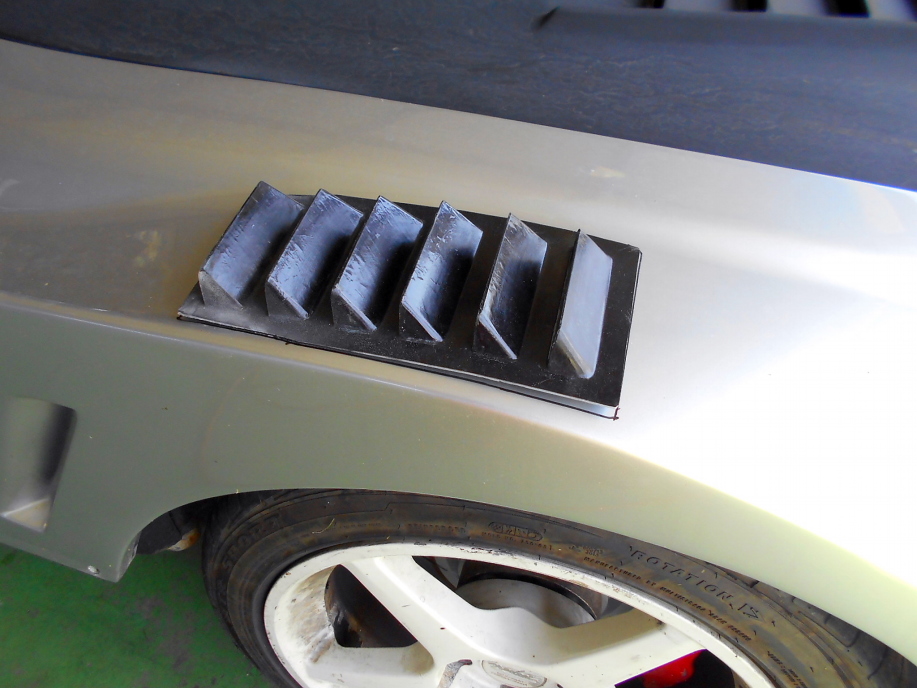 固定は少しずつ付けては冷まし、ダクトの取付面がフェンダーの面よりほんの少し(0.5mm位)沈む程度に調整しながら行います。 |