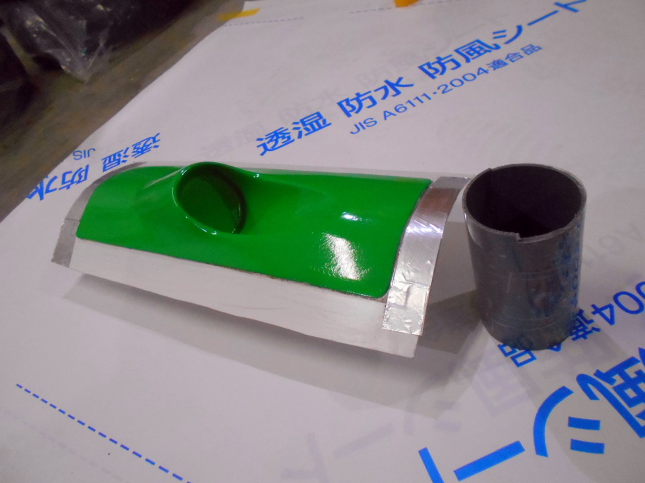 | FRP管とダクト本体はガラスマット2〜3プライ貼って接着します。 | |