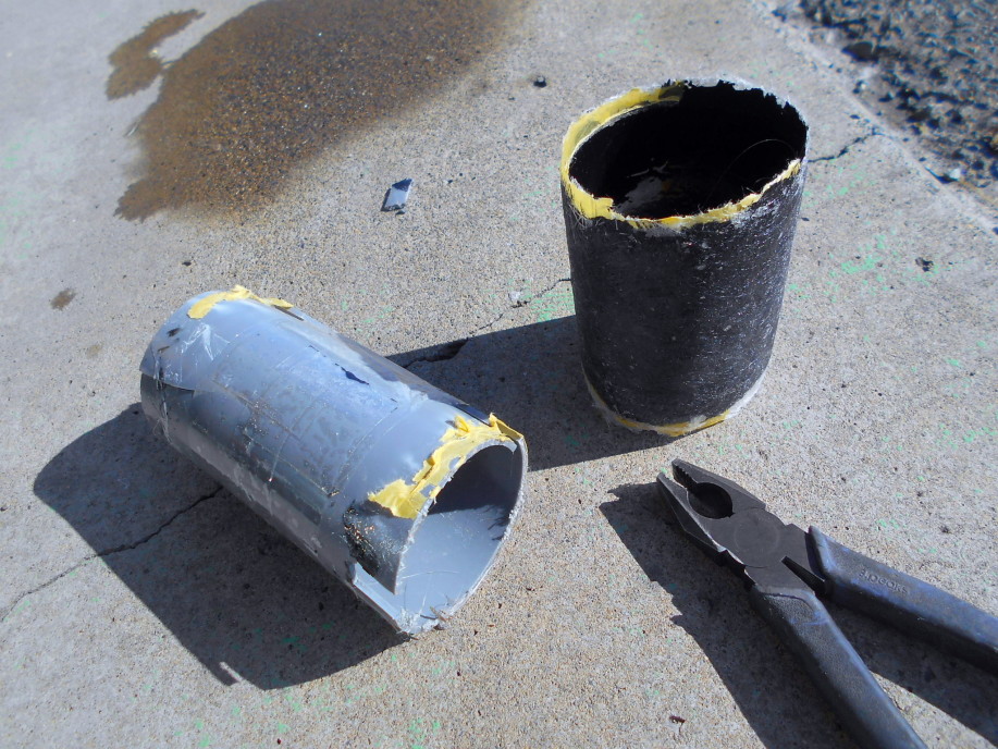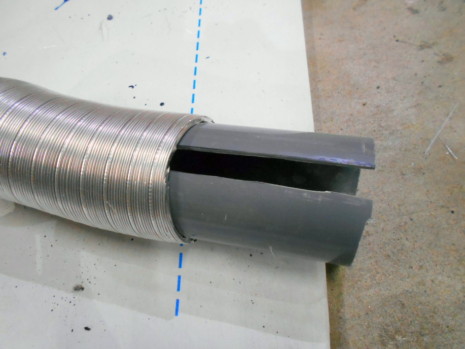 | 上記までの成形品ではアルミの蛇腹ダクトを接続出来ないので、別途FRPでパイプを作る必要が出てきました。 使用予定の75Φの蛇腹ダクトを丁度良く差し込める素材が見つからなかったのでやや太めの径(外形が90mm弱)の塩ビパイプを調整して使用します。 ←のように10mm程度縦にカットし、75Φのダクトに差し込めるように加工します。 |