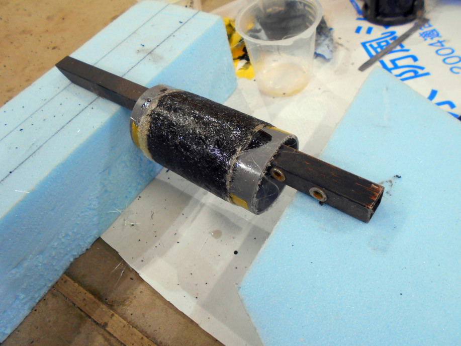 | そしてゲルコートを塗ってガラスマットを積層しますが、このように固定してパイプを回しながら帯状に切ったガラスマットを巻きながら樹脂を塗っていくと簡単です。 グルグルと3〜4回巻いておきます。 |