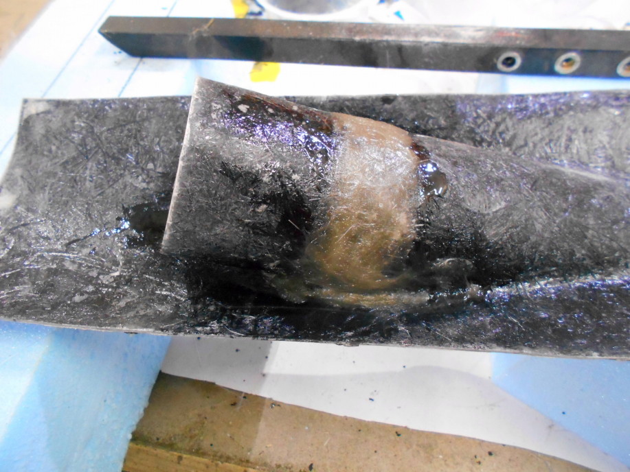 | 現在手持ちのガラスマットが#230しか無いので6プライ程度積層(#4503プライ相当)してメス型完成です。 形状的に不安定なので作業時の安定&メス型補強の為、木で枠を作って取り付けてあります。 |