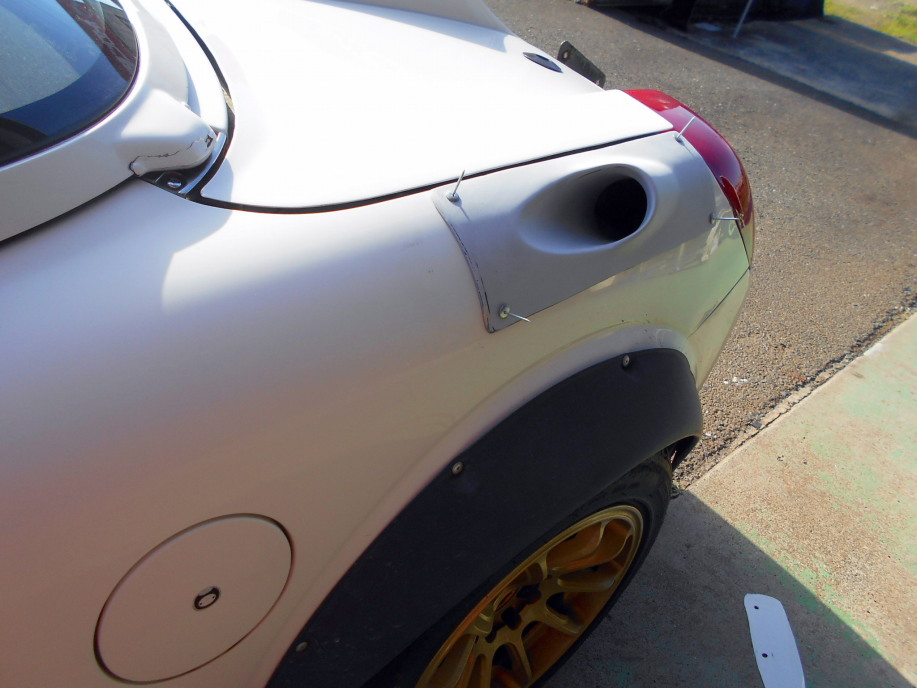 | ダクトも細かい仕上げと塗装を残すのみとなったので取り付け準備。 メス型から型紙を起こし、マーキングしてサンダーとかエアソーでリアフェンダーを切り抜きます。 |