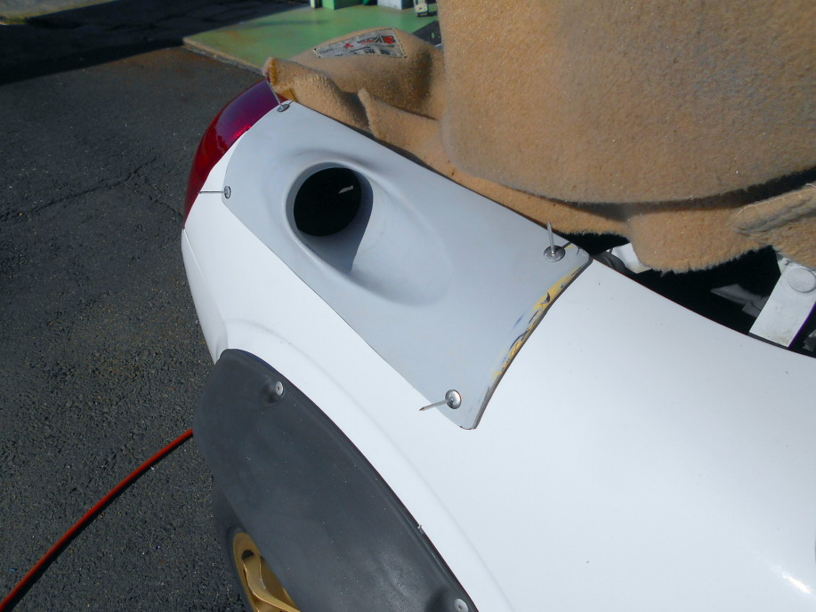 | ダクトを仮置きして取り付け用のリベット穴をあけます。 フィッティングはバッチリ。 見た目も中々イイ感じです♪ |